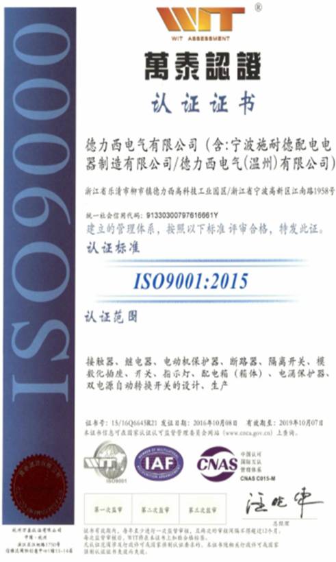 德力西电气一直重视对产品的过程控制和质量管理,公司自1995年获得ISO9001:1994国际质量管理体系认证,我们在质量管理体系上始终与国际标准保持同步,持续依据最新ISO9001国际标准,实施质量管理体系的持续改进。公司连续二十多年通过了ISO9001国际质量管理体系每年一次的监督审核,每三年一次换证审核。