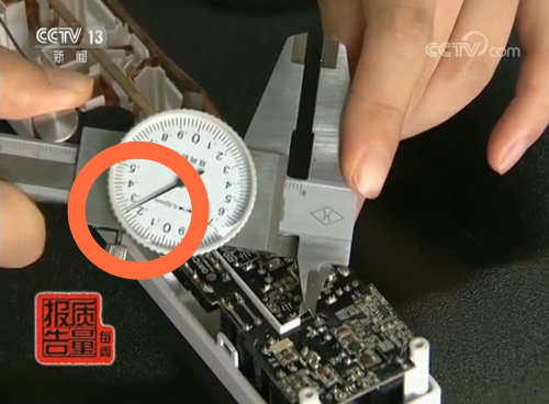 可以看出这个不合格的产品初、次级电路距离为3毫米,而按照相关标准,初、次级电路间的距离至少要达到5.92毫米↓