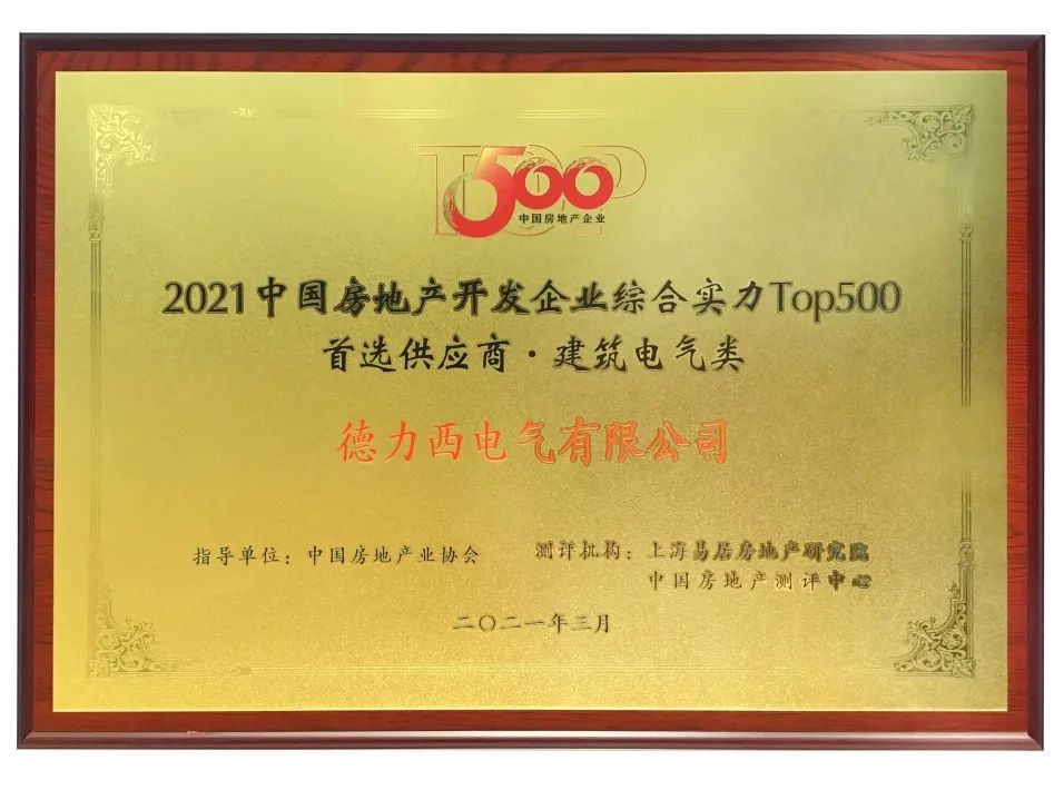 3月16日,以“远见·共赢”为主题的中国房地产开发企业综合实力测评成果发布会暨房地产高峰论坛在上海盛大召开,《2021中国房地产开发企业综合实力TOP500首选供应商服务商品牌测评研究报告》揭晓。德力西电气再度荣获2021中国房地产开发企业综合实力TOP500建筑电气类首选供应商品牌,这已是德力西电气连续8年蝉联此类奖项,以强劲的综合实力持续成为500强房地产企业值得信赖的战略合作伙伴。
