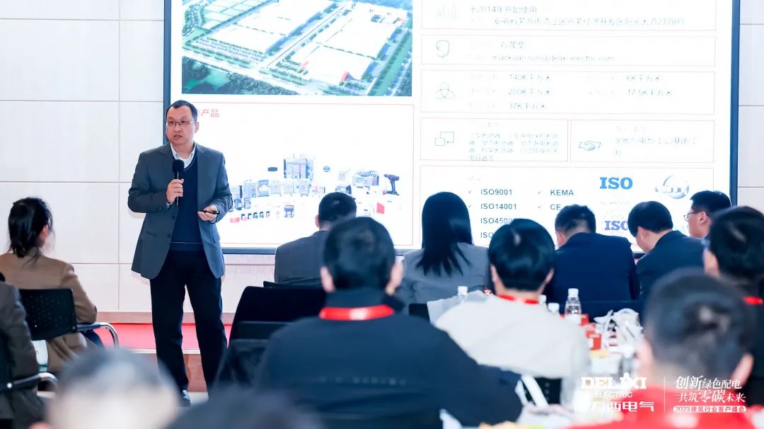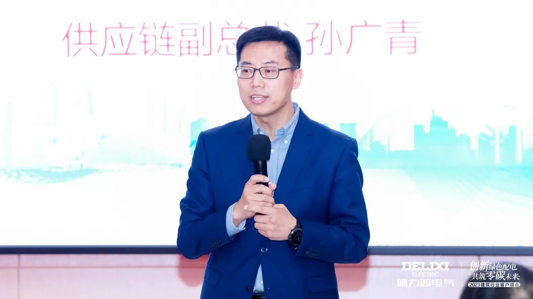 会议伊始,德力西电气供应链副总裁孙广青首先发表致辞:“德力西电气多年来始终践行可持续发展战略,逐步建立起完备的绿色制造体系。德力西电气芜湖基地更是于近日获得零碳工厂(Ⅰ型)五星级证书,成为国内低压电气行业首家零碳工厂。在走好自身绿色之路的同时,我们也将积极联动产业链合作伙伴,携手向可持续目标迈进。”