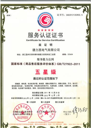 依据GB/T27922-2011《商品售后服务评价体系》和 GB/T27925-2011《商品企业品牌评价与企业文化建设指南》标准要求,专家组评审通过在品牌品质、声誉、影响、企业文化等要素;公司及服务网点的服务体系、商品服务、顾客服务和管理等方面对德力西电气进行了全面严格的审核,并对德力西电气多年来坚持品牌建设和领先行业的售后服务给予了最高肯定和褒奖。