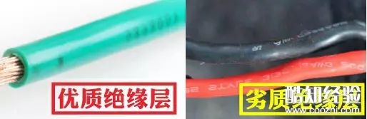绝缘层就是电线的外皮。优质的电线,外皮一般采用高分子聚氯乙烯,绝缘性好,耐高温,强度高,阻燃效果好不易变形褪色。表面细腻有光泽,有一定厚度。劣质的电线,绝缘层采用的普通塑料或者是回收再利用的塑料,表面暗淡,材质轻薄,没有质感,高温下容易老化变形,绝缘性差,容易燃烧,这样的电线非常不安全。