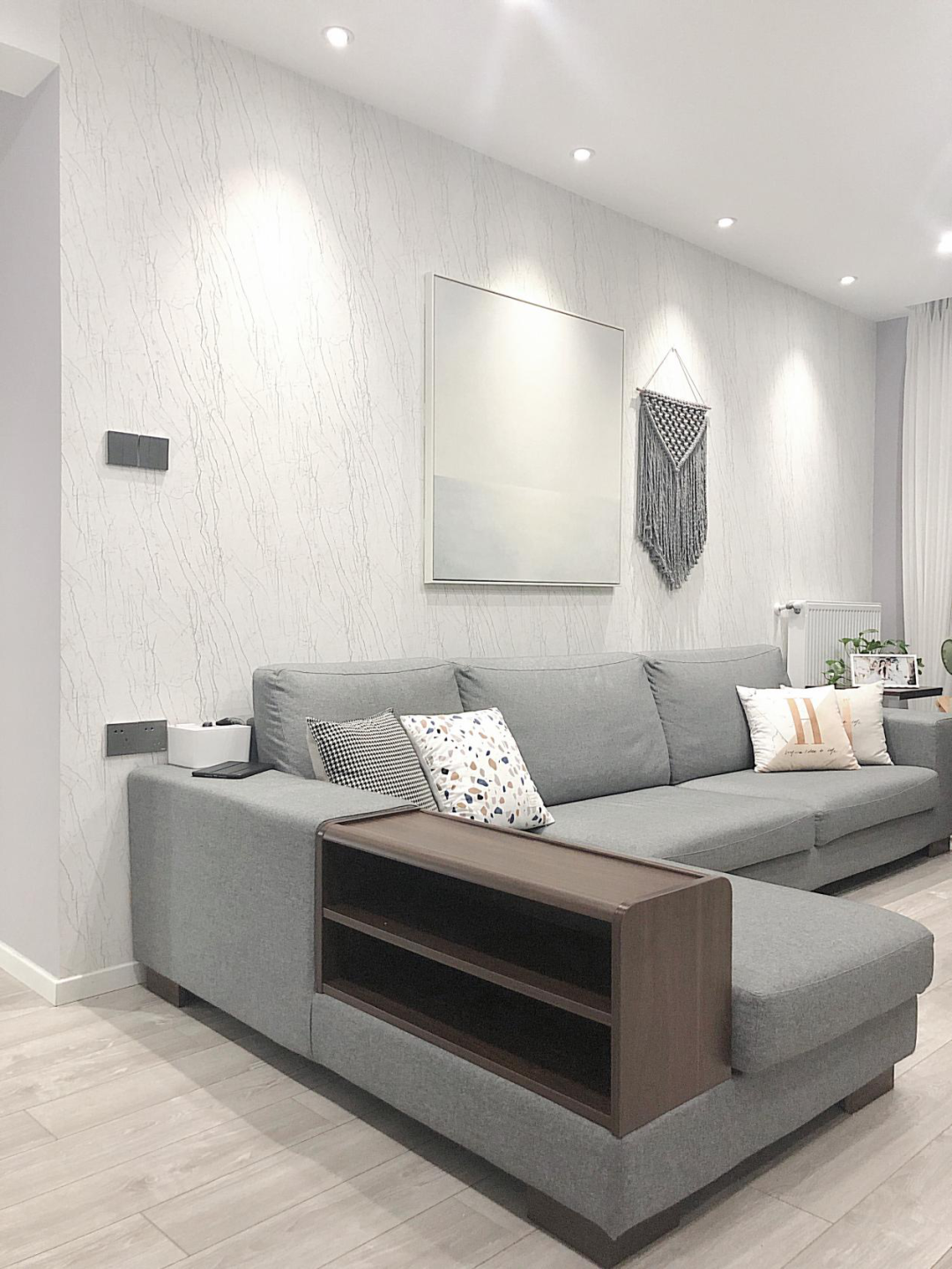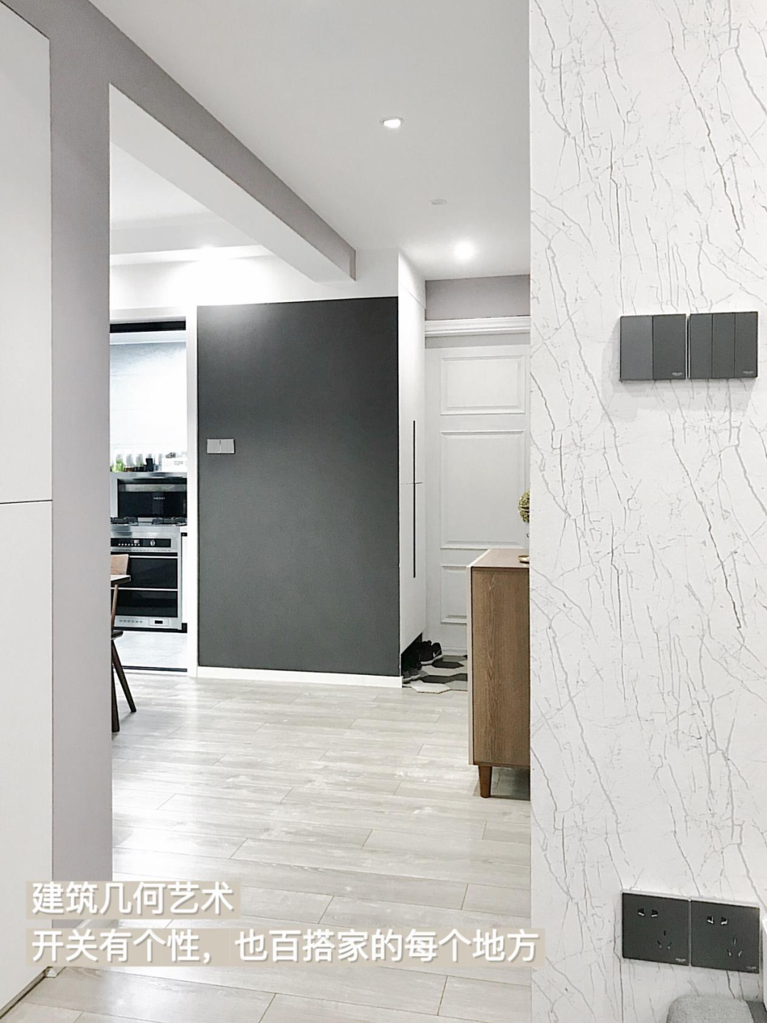 另一侧墙面是浅灰色的墙纸,和“叠彩”插座同属一个色系,和墙面的黑色挂钟,侧面的白色柜子,组成深浅不一的黑白灰色彩效果。