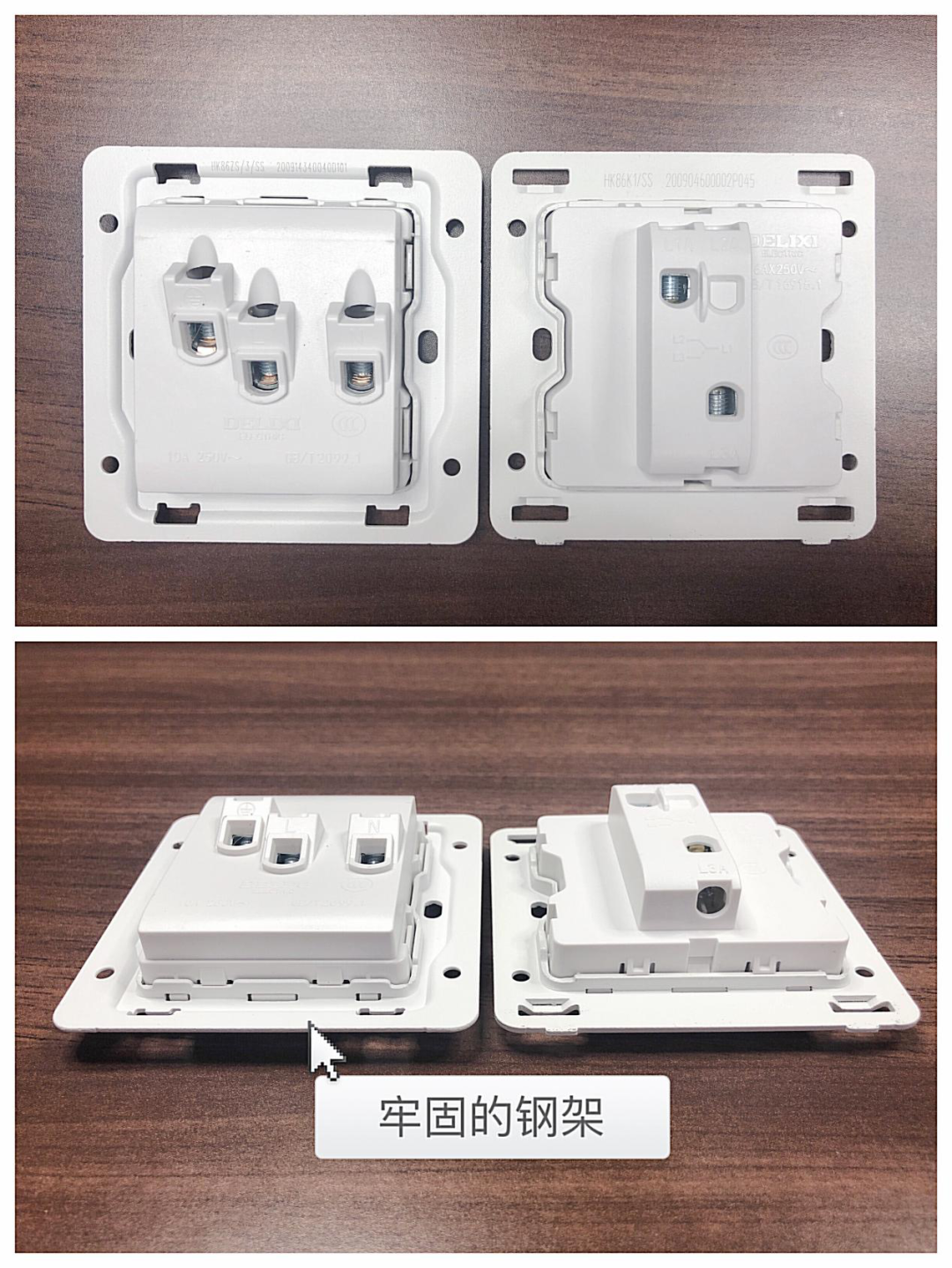 开关插座中间的框架全采用和底座同款的加厚钢架,不易变形,不仅美观而且牢固,使用更安心。