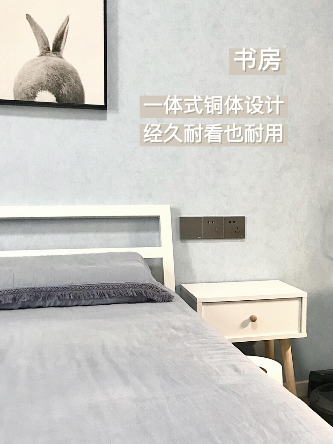 书房有一面饱和度比较低的蓝色墙纸,星空灰的开关插座装在墙上是意外的好看呢,非常沉稳,更好营造出平静的学习工作氛围。