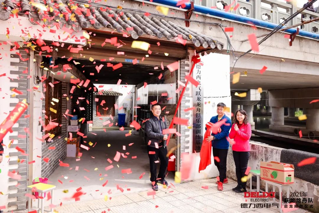 近日,德力西电气跃龙龙舟俱乐部基地正式举行揭牌仪式,温州市龙舟协会主席亓斌、温州市社会体育指导主任项君伟、乐清市龙舟协会会长吴阿将、德力西电气首席文化官胡晓春等人共同出席并剪彩揭幕,为德力西电气跃龙龙舟队新一年的征战之旅加油助力。