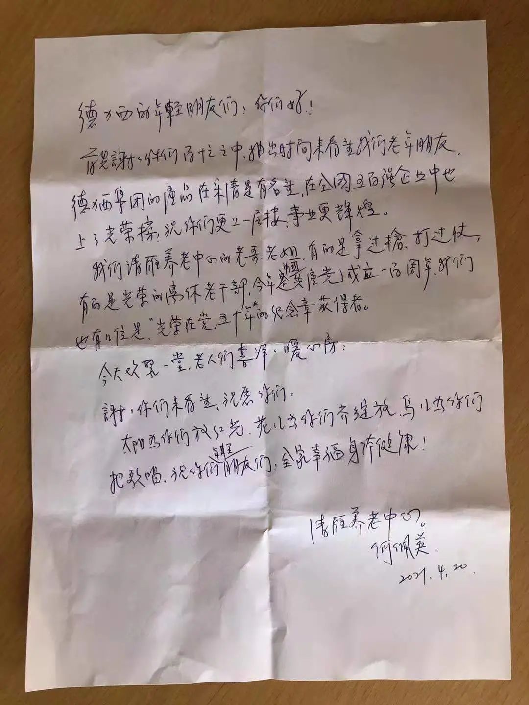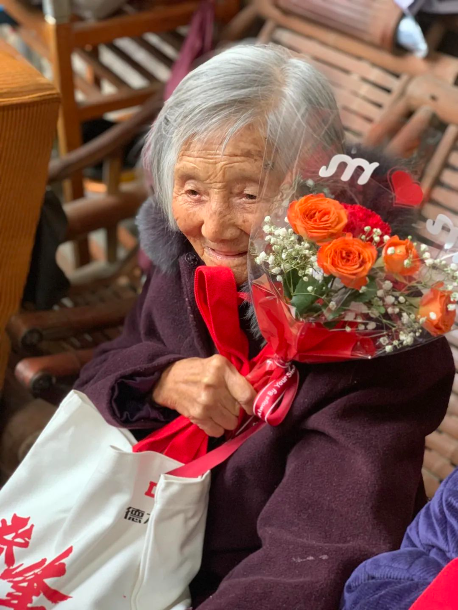 浙江柳市清雁养老院的老人们有的扛过枪、上过战场,有的是光荣离休的老干部。活动最后,一位当过20年兵,党龄有56年之久的阿婆代表发言,感谢德家志愿者,还为我们送上了祝福语:太阳为你们放红光,花儿为你们齐绽放,鸟儿为你们把歌唱,祝志愿者们全家幸福,身体健康!
