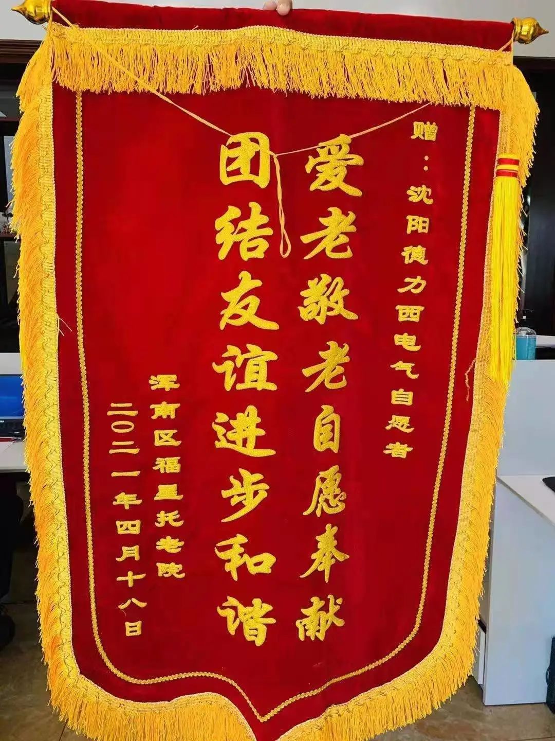 生日会后,辽宁福星托老院郝院长给志愿者们赠送了锦旗,“这次生日会,年轻人们带来了关心和热闹,给了老人们很大的精神安慰,真的非常感谢德力西电气的公益善举!” 郝院长表示,“因为疫情原因,已经很久没有外来人员看望过他们了,此次德力西电气的到来使老人们喜出望外,活动后还念叨着让我转告小朋友们要经常来看望他们呢。”