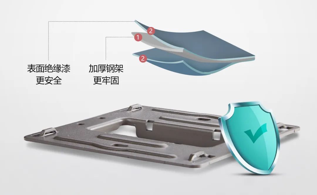建筑之固屹立百年,溢彩系列墙面开关一脉相承其匠心,造就更为耐用的品质。开关采用升级1.2mm厚度钢架,表面均涂绝缘漆,保证牢固不变形的同时兼顾安全性。