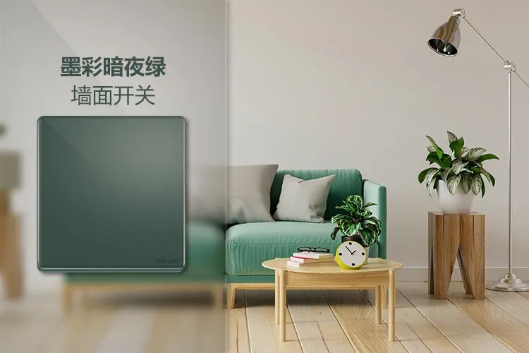 点缀装饰画、绿植、墨彩暗夜绿墙面开关